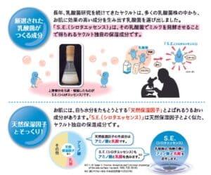 ヤクルトといえば乳酸菌ですよね。ラクティフルには、ヤクルトが長年の研究で培った独自の乳酸菌由来成分「S.E.(シロタエッセンス)」がたっぷりと配合されているんです。この成分は、私たちの肌にもともと存在する天然保湿因子(NMF)とよく似た構造をしているのが特徴。だからこそ、肌にスーッと馴染んで、角質層のすみずみまで潤いを届けてくれるんですね。